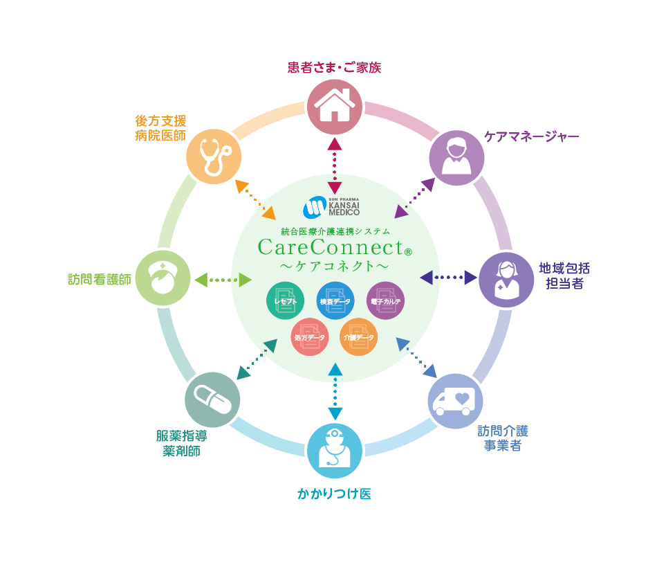 このシステムを活用することにより、医師・歯科医師・薬剤師・訪問看護師・介護事業所・ケアマネージャー・理学療法士など多職種が、各事業所の枠を超えオンライン上で安全に情報を共有することが可能となります。