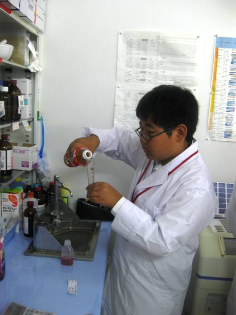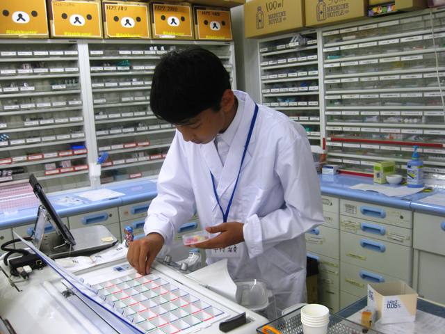 疑似処方箋を作っていますので、薬剤師1人が1人の学生さんについて薬剤師の業務である調剤、監査を説明しながら体験してもらいました。
