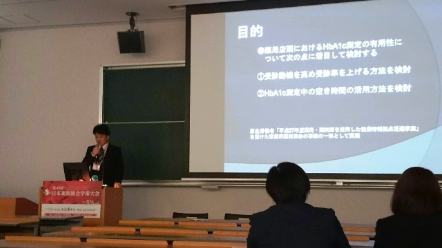 2016年10月14日 第49回日本薬剤師会学術大会において、口頭発表1演題の発表を行ないました 2016年10月9日・10日の2日間、名古屋市で開催された第49回日本薬剤師会学術大会 において サン薬局木津店 小川康弘が京都府薬剤師会の事業の中で取り組んだ 「薬局におけるHbA1c測定と受診勧奨、MMSEによる認知機能評価の試み」 の研究結果ついて学会発表しました。 今後も『薬局で頑張っていること』を積極的に発表して、薬剤師全体のスキルアップ により地域医療の質的向上に貢献していきたいと考えています。